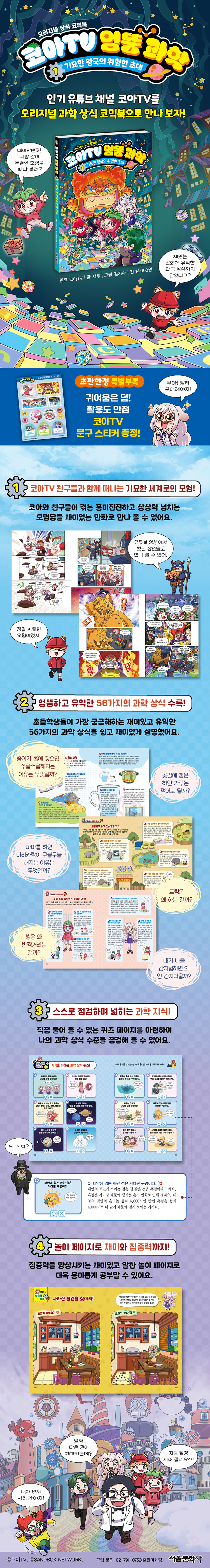 이번에 출간된 《코아TV 엉뚱 과학》 1권 『기묘한 왕국의 위험한 초대』는 코아TV의 인기 있는 크루들이 등장하는 오리지널 상식 코믹북으로, 깨어날 수 없는 잠에 빠진 그들의 친구 드림 박사를 구하기 위한 기상천외한 여정을 담고 있다.